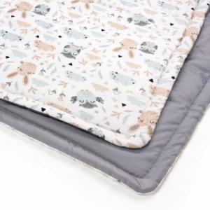 Przednia część koca ozdobiona jest miękką bawełną w uroczym wzorze. Dodatkowo koc wyposażony jest w wygodny rzep i rączki, które po złożeniu tworzą kompaktowy pakunek. Doskonały towarzysz podczas wycieczek, biwaków czy zabaw na plaży.