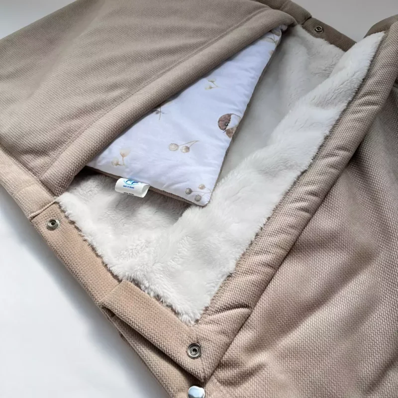 Praktyczny i elegancki kocyk stworzony z myślą o komforcie maluszka i wygodzie rodzica. Nasz model to połączenie miękkiego, oddychającego velvetu na zewnątrz oraz niezwykle przyjemnego w dotyku pluszu minky wewnątrz. Dzięki temu śpiworek otula dziecko, zapewniając mu ciepło i poczucie bezpieczeństwa podczas spacerów, drzemek czy podróży.
