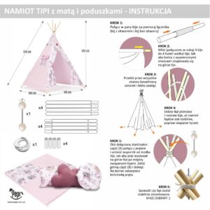 Namiot został uszyty w Polsce z naturalnej bawełny, zarówno dla dziewczynki jak i chłopca. Posiada okienko z zasłonką. Wejście do namiotu ozdabia podwiązywana tasiemkami kurtynka, którą można rozwinąć. Komplet zawiera namiot, miękką bawełnianą matę z wypełnieniem do zabawy oraz poduszki dekoracyjne. GRATIS stabilizator do montażu w miejscu krzyżowania się kijów.