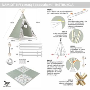 Namiot został uszyty w Polsce z naturalnej bawełny, zarówno dla dziewczynki jak i chłopca. Posiada okienko z zasłonką. Wejście do namiotu ozdabia podwiązywana tasiemkami kurtynka, którą można rozwinąć. Komplet zawiera namiot wraz z miękką bawełnianą matą. GRATIS stabilizator do montażu w miejscu krzyżowania się kijów.