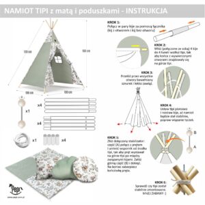 Namiot został uszyty w Polsce z naturalnej bawełny, zarówno dla dziewczynki jak i chłopca. Posiada okienko z zasłonką. Wejście do namiotu ozdabia podwiązywana tasiemkami kurtynka, którą można rozwinąć. Komplet zawiera namiot, miękką bawełnianą matę z wypełnieniem do zabawy oraz poduszki dekoracyjne. GRATIS stabilizator do montażu w miejscu krzyżowania się kijów.
