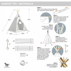 Namiot został uszyty w Polsce z naturalnej bawełny, zarówno dla dziewczynki jak i chłopca. Posiada okienko z zasłonką. Wejście do namiotu ozdabia podwiązywana tasiemkami kurtynka, którą można rozwinąć. GRATIS stabilizator do montażu w miejscu krzyżowania się kijów.