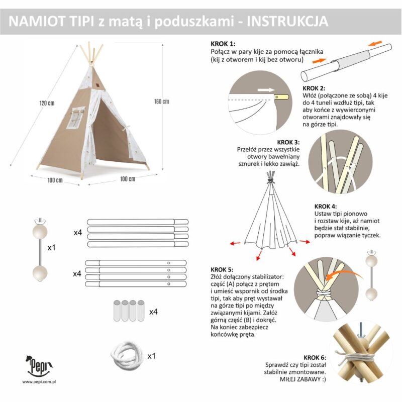 Namiot został uszyty w Polsce z naturalnej bawełny, zarówno dla dziewczynki jak i chłopca. Posiada okienko z zasłonką. Wejście do namiotu ozdabia podwiązywana tasiemkami kurtynka, którą można rozwinąć. GRATIS stabilizator do montażu w miejscu krzyżowania się kijów.