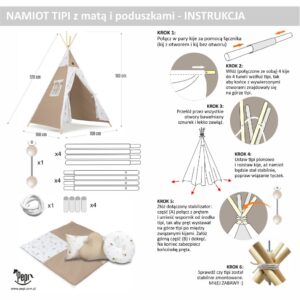 Namiot został uszyty w Polsce z naturalnej bawełny, zarówno dla dziewczynki jak i chłopca. Posiada okienko z zasłonką. Wejście do namiotu ozdabia podwiązywana tasiemkami kurtynka, którą można rozwinąć. Komplet zawiera namiot, miękką bawełnianą matę z wypełnieniem do zabawy oraz poduszki dekoracyjne. GRATIS stabilizator do montażu w miejscu krzyżowania się kijów.
