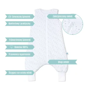 Śpiworek z nogawkami to idealne rozwiązanie przez cały rok, zarówno w dzień jak i w nocy, podczas drzemki czy zabawy. Zastępuje kołdrę, kocyk – nie trzeba dodatkowo nakrywać dziecka.