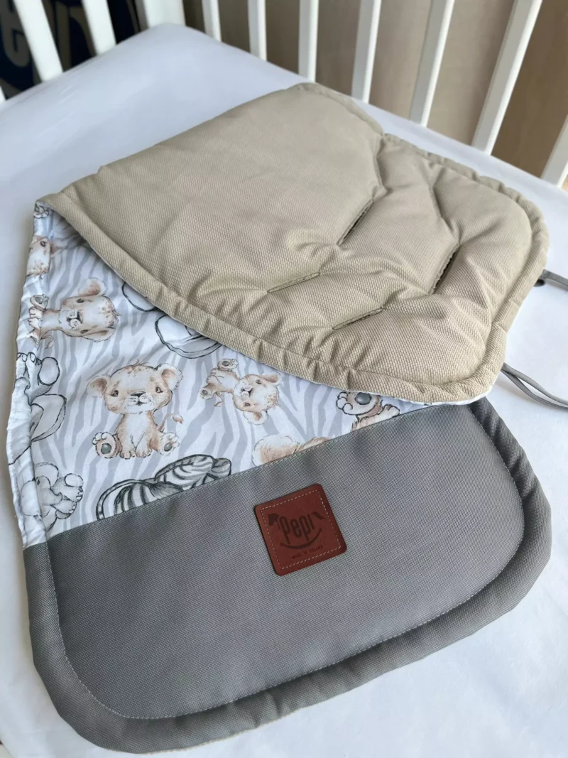 Idealnie dopasowana, zawsze na miejscu i czysta! Nasza dwustronna uniwersalna wkładka do spacerówki, dzięki 6 otworom na pasy pasuje do większości wózków i fotelików-kołysek. Troczki mocujące zapobiegają jej przesuwaniu, a wodoodporny podnóżek chroni przed brudem z bucików.