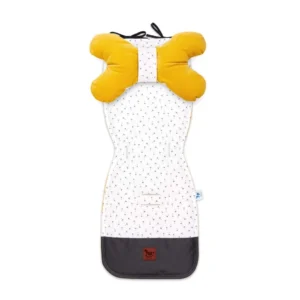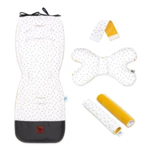 Zestaw składa się z dwustronnej wkładki do wózka, poduszki MOTYLEK, opaski z rzepem oraz dwóch ochraniaczy na pasy.