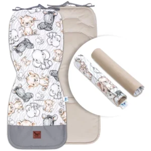 Zestaw składa się z dwustronnej wkładki do wózka oraz dwóch ochraniaczy na pasy.