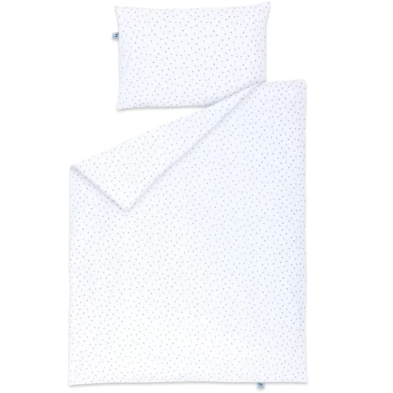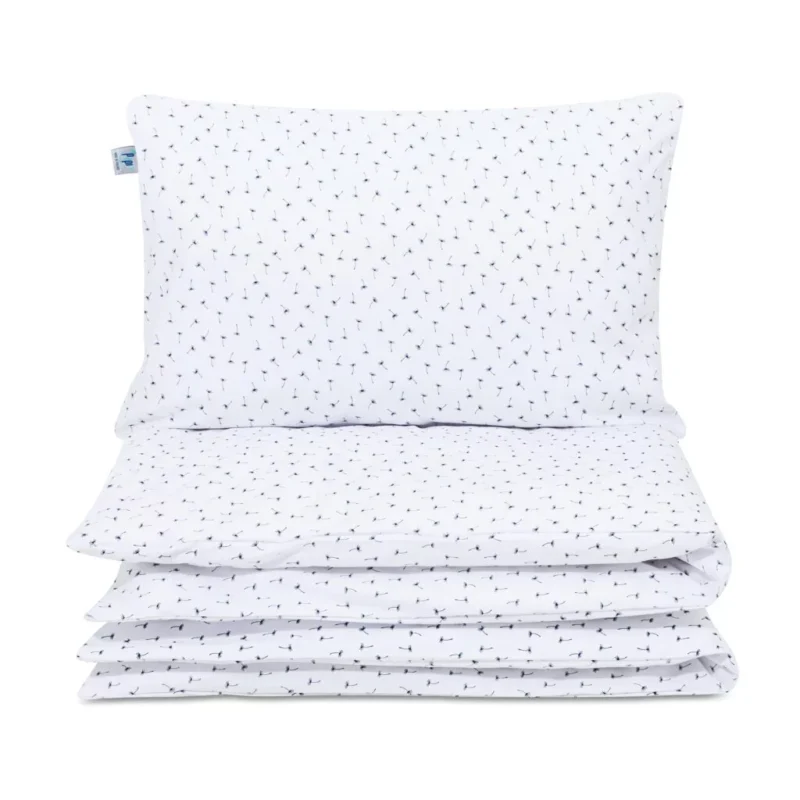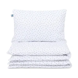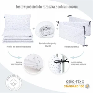 Zawiera wszystko, co niezbędne na start: poszwę na kołderkę (90×120), poszwę na poduszkę (60×120), praktyczne prześcieradło (60×40) oraz miękki ochraniacz.