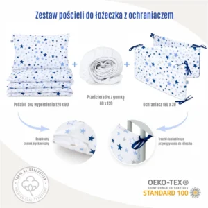 Zawiera wszystko, co niezbędne na start: poszwę na kołderkę (90×120), poszwę na poduszkę (60×120), praktyczne prześcieradło (60×40) oraz miękki ochraniacz.