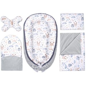 Harmonia i spokój w jednym zestawie! Wyobraź sobie, jak wszystkie elementy wyprawki, od kokonu po kocyk, idealnie do siebie pasują, tworząc spójną i piękną całość w pokoiku Twojego dziecka. Poczuj ulgę, mając wszystko, czego potrzebujesz, w jednym, przemyślanym zestawie. Zestaw zawiera: kokon, dwie poduszki, kocyk oraz dwustronny materacyk do kokonu, wszystko zaprojektowane z myślą o wygodzie i bezpieczeństwie dziecka.