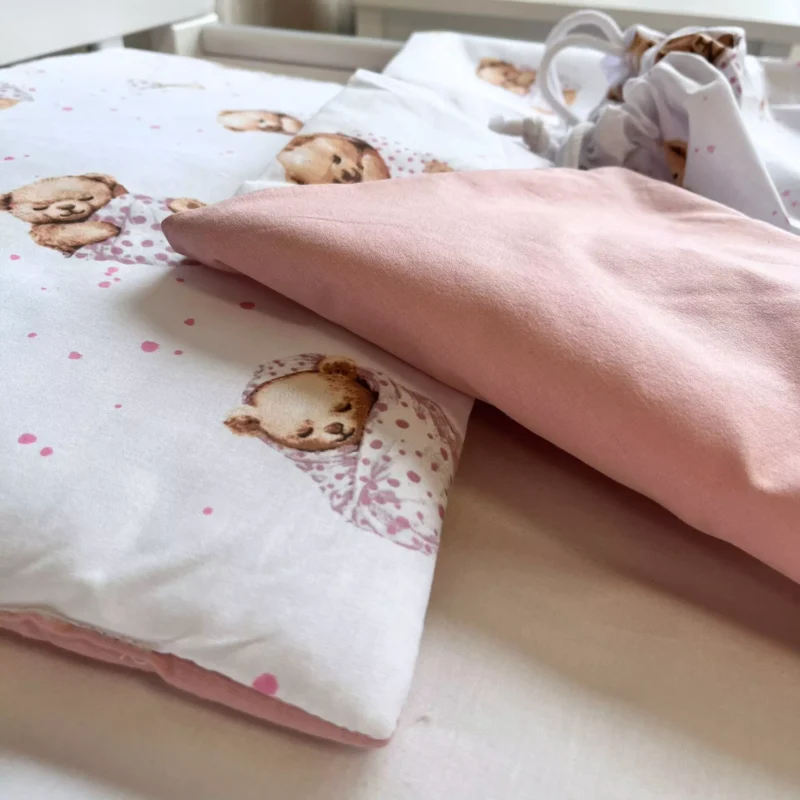 Zestaw do żłobka z płaską poduszką – White Sleeping Teddy Bear – bawełna