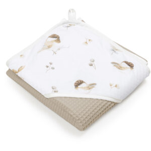 Zestaw kąpielowy ręcznik z kapturem mokka i 2 małe ręczniki Lovely Bird